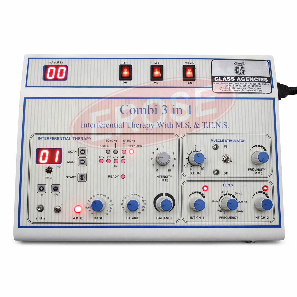 Erose Combination Therapy IFT TENS MS Unit manufactured by Glass Agencies for physical therapy clinics, rehabilitation centers, and hospital needs several electrotherapy modality in an individual organization. The current units of measurement include Interferential Therapy, Transcutaneous Electrical Nerve Stimulation, and Muscle Stimulation in order to facilitate inclusive treatment sessions. The framework is simple to operate the restrain panel together with a clear labelling context to select treatment method, intensity, and duration. The digital display allows parameter monitoring at target speed during use. The IFT technique uses medium frequency current to stimulate the deep tissues of the body, facilitating pain leadership and circulation development. The TENS method uses the control nerve stimulation normally used to relieve acute accent and chronic agitation. The mechanism of the MS contributes to the stimulation and strengthening of the muscle by the delivery of targeted electrical current. To maintain stable waveform dispatch throughout therapy sessions, end product channels are configured. The compact cabinet frame is easy to place in a clinical environment as a support form for cable connection. The unit of measurement shall be built together with a protective outer shell which is resistant to normal use in professional environments. The smooth facade completes simple cleaning according to clinical health standards. The device includes safety features such as monitored final product management and secure electrode connections for safe, precise operation. Before dispatch, each measuring unit is subject to electrical testing and verification to verify its stability. Erose amalgamation Therapy IFT TENS MS Unit helps therapists to manage musculoskeletal conditions, tournament injuries, postoperative rehabilitation, and general muscle therapy initiatives. In order to maintain reliable functioning and functional robustness, glass companies follow rigorous development supervision. The combined design reduces the need for separating devices and assists the clinic in successfully managing the space. The current therapy system facilitates the design of a structured therapy plan and provides control electrical stimulation during rehabilitation programs. The unit of measurement provides reliable waveform coefficients, a controllable intensity level, and a smooth transition between different therapy methods, which makes it suitable for uninterrupted competent use in physiotherapy and rehabilitation.