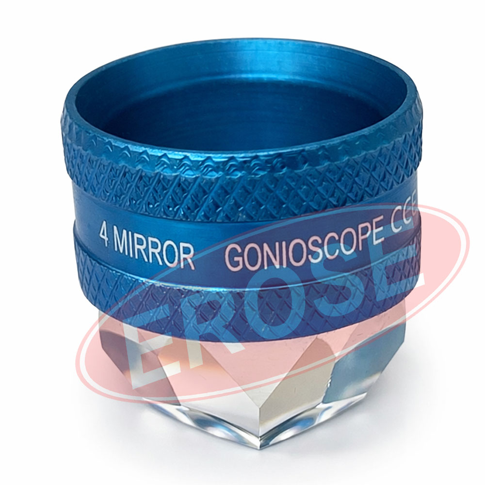 Four Mirror Gonioscopy Lens by Erose, manufactured by Glass Agencies, used for anterior chamber angle observation during ophthalmic examination.